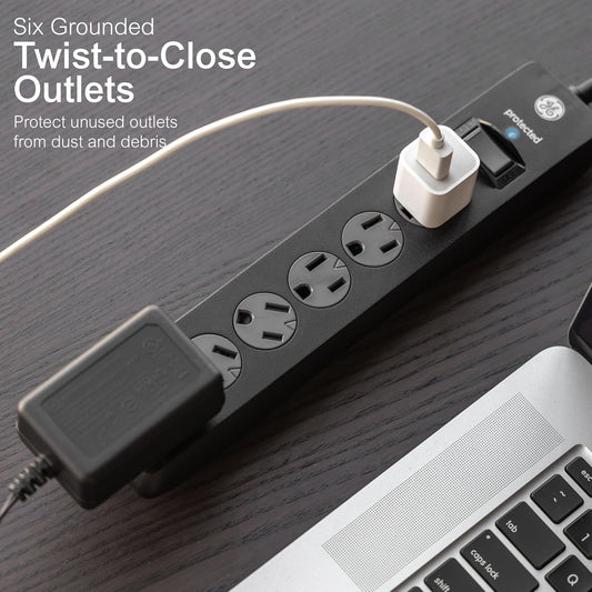 Sur Protector Power Strip, 15 Ft Extension Cord, 6 Outlet Extender, 800 Joules, Flat Plug, Twist-To-Close Safety Covers, ETL Listed, Black, 50767